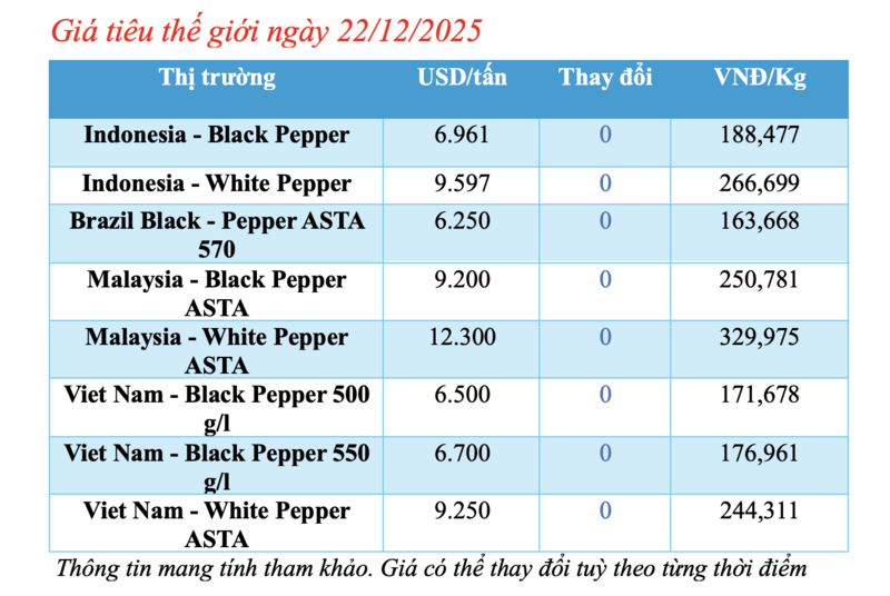 Cập nhật giá tiêu thế giới từ Hiệp hội Hồ tiêu Quốc tế (IPC) sáng 22/12/2025, hồ tiêu xuất khẩu hôm nay không ghi nhận biến động. Các thị trường đều ổn định giá so với phiên giao dịch hôm qua.