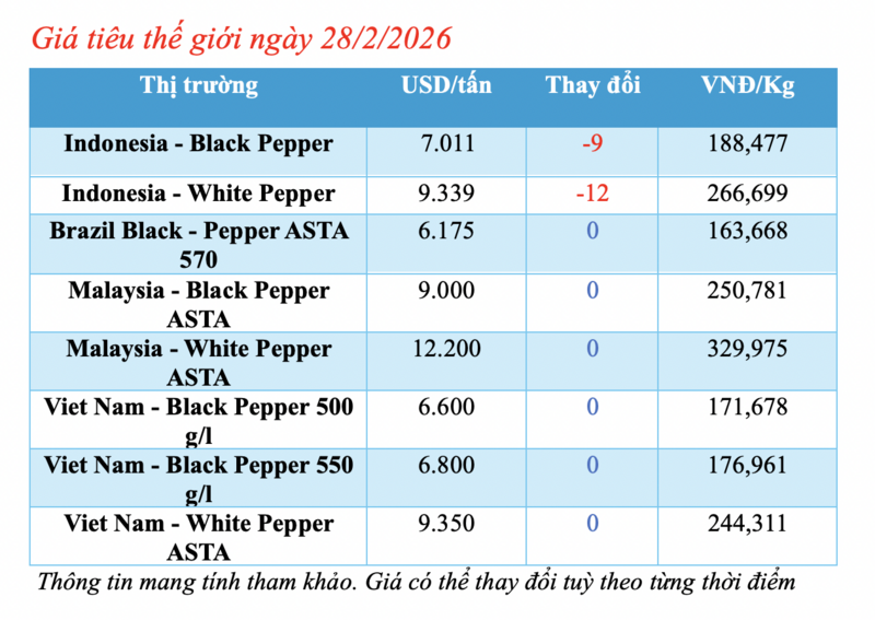 Cập nhật giá tiêu thế giới từ Hiệp hội Hồ tiêu Quốc tế (IPC) sáng 28/2/2026, hồ tiêu xuất khẩu hôm nay tiếp tục ghi nhận biến động mới từ thị trường Indonesia. Các thị trường khác đều duy trì mức giá ổn định so với phiên giao dịch trước.