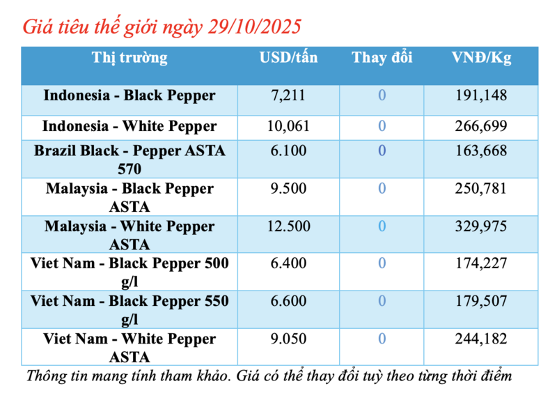 Cập nhật giá tiêu thế giới từ Hiệp hội Hồ tiêu Quốc tế (IPC) lúc 4 giờ 30 phút sáng 29/10/2025, thị trường hồ tiêu xuất khẩu hôm nay không ghi nhận biến động. Các thị trường đều ổn định giá so với hôm qua.