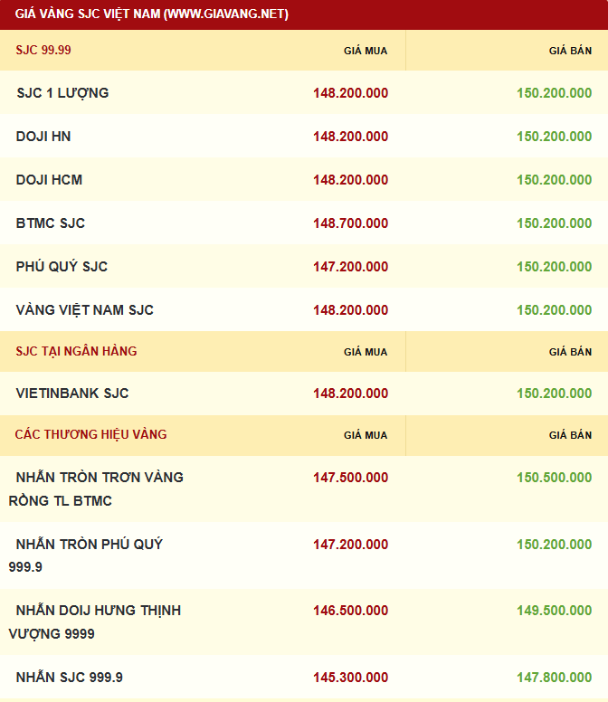 Giá vàng miếng được Công ty TNHH MTV Vàng bạc đá quý Sài Gòn - SJC, Tập đoàn DOJI, Bảo Tín Minh Châu, PNJ cùng niêm yết giá vàng ở mức 148,2 - 150,2 triệu đồng/lượng (mua vào - bán ra), mức giá tăng 1,8 triệu đồng/lượng ở cả hai chiều mua - bán so với hôm qua.