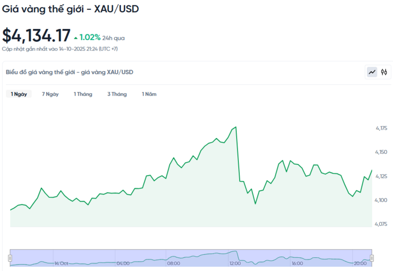 Giá vàng thế giới hôm nay 15/10/2025 và biểu đồ biến động giá vàng thế giới 24h qua
