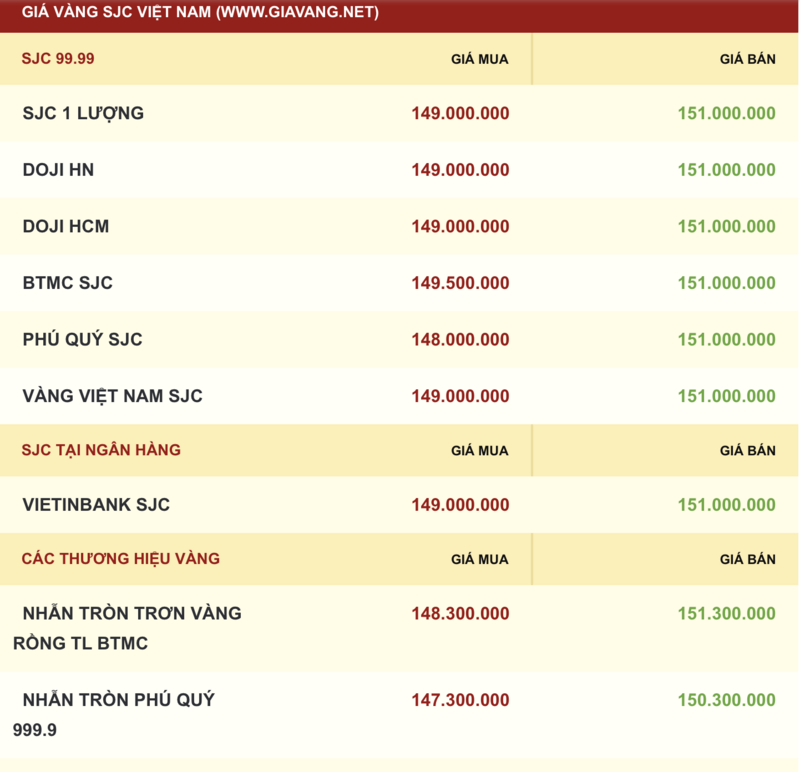 Giá vàng miếng được Công ty TNHH MTV Vàng bạc đá quý Sài Gòn - SJC, Tập đoàn DOJI, PNJ cùng niêm yết giá vàng ở mức 149 - 151 triệu đồng/lượng (mua vào - bán ra), mức giá tăng 1,7 triệu đồng/lượng ở cả hai chiều mua - bán so với hôm qua.