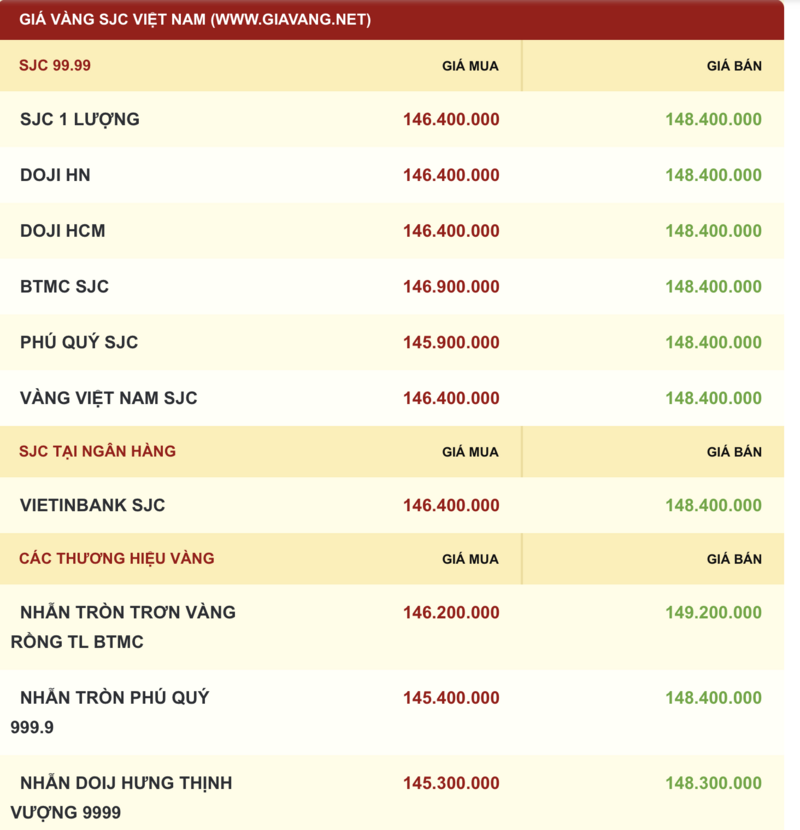 Giá vàng miếng được Công ty TNHH MTV Vàng bạc đá quý Sài Gòn - SJC, Tập đoàn DOJI, PNJ cùng niêm yết giá vàng ở mức 146,9 - 148,4 triệu đồng/lượng (mua vào - bán ra), mức giá không thay đổi ở cả hai chiều mua - bán so với hôm qua, giảm 1,1 triệu đồng/lượng ở chiều mua - giảm 800 nghìn đồng/lượng ở chiều bán so với cuối tuần trước.