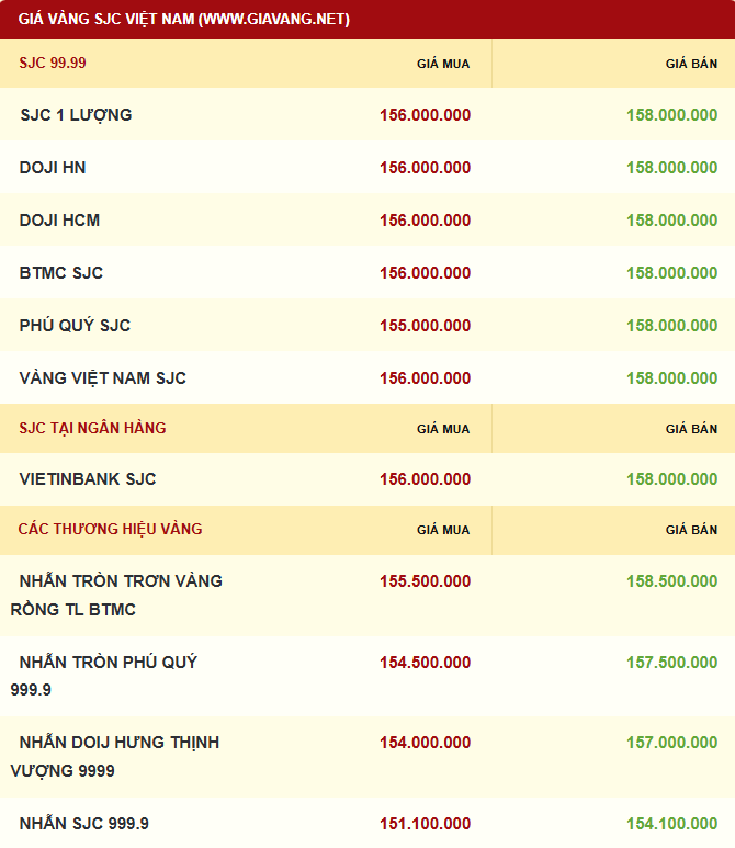 Giá vàng miếng được Công ty TNHH MTV Vàng bạc đá quý Sài Gòn - SJC, Bảo Tín Minh Châu, PNJ, Tập đoàn DOJI cùng niêm yết giá vàng ở mức 156-158 triệu đồng/lượng (mua vào - bán ra), mức giá giảm 1,7 triệu đồng/lượng ở cả hai chiều mua - bán so với hôm qua. Chênh lệch giá mua vào - bán ra ở mức 2 triệu đồng.