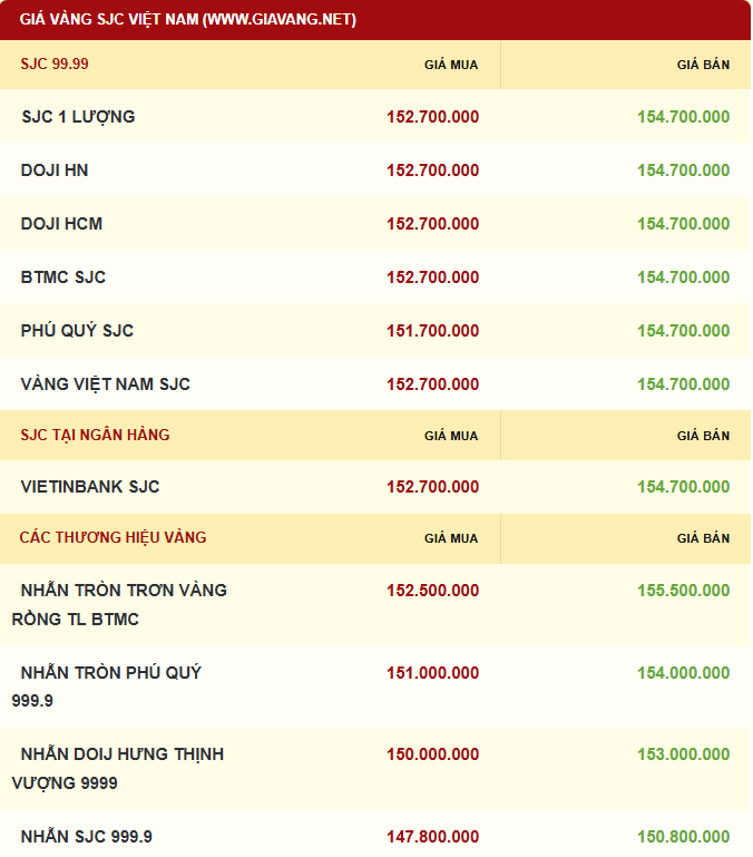 Giá vàng miếng được Công ty TNHH MTV Vàng bạc đá quý Sài Gòn - SJC, Bảo Tín Minh Châu, PNJ, Tập đoàn DOJI cùng niêm yết giá vàng ở mức 152,7-154,7 triệu đồng/lượng (mua vào - bán ra), mức giá giảm 3,3 triệu đồng/lượng ở cả hai chiều mua - bán so với hôm qua. Chênh lệch giá mua vào - bán ra ở mức 2 triệu đồng.