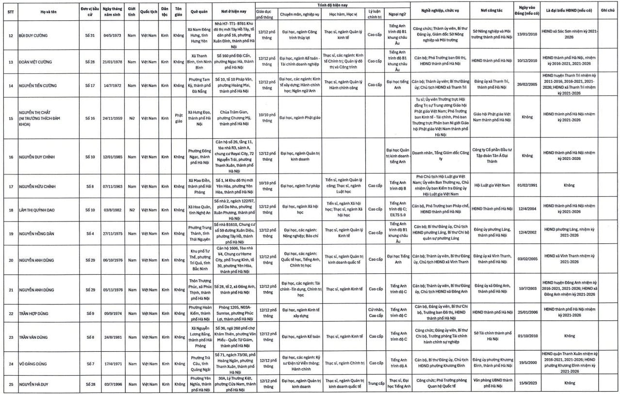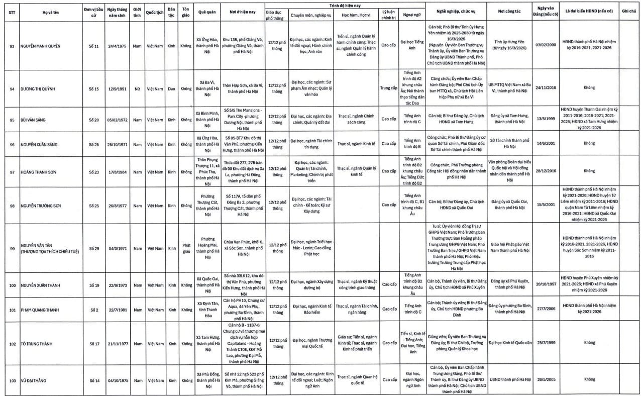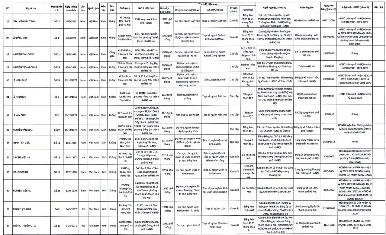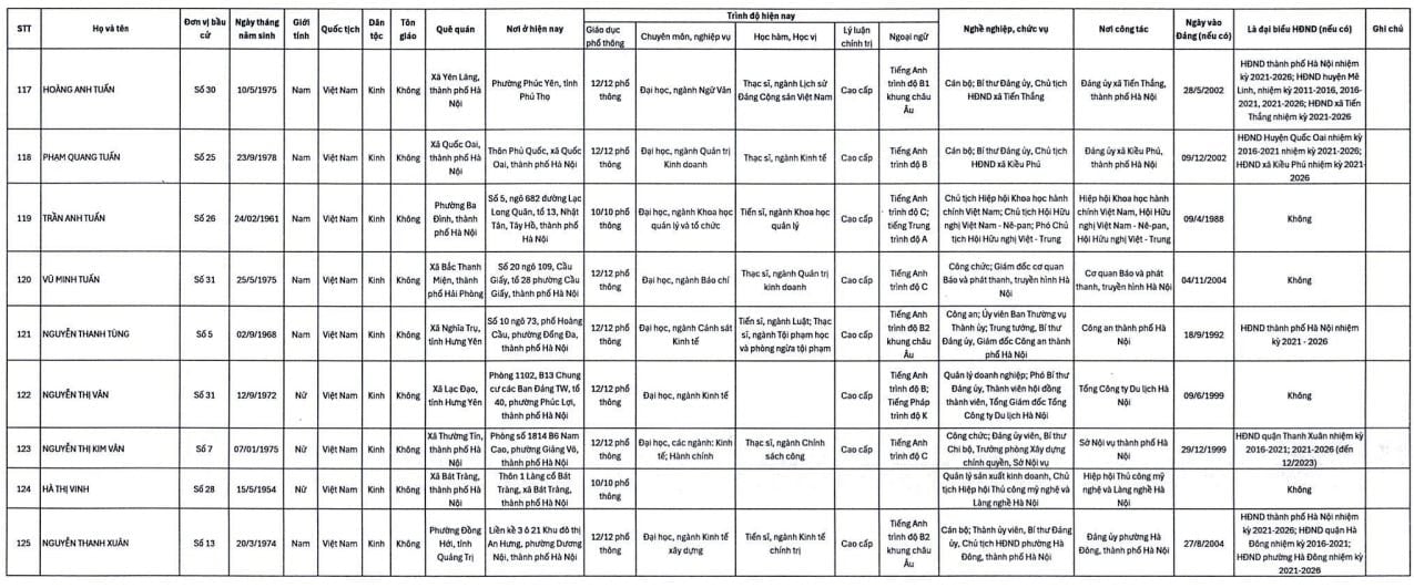 Danh sách trúng cử đại biểu HĐND TP. Hà Nội nhiệm kỳ 2026-2031 gồm 125 người như sau: