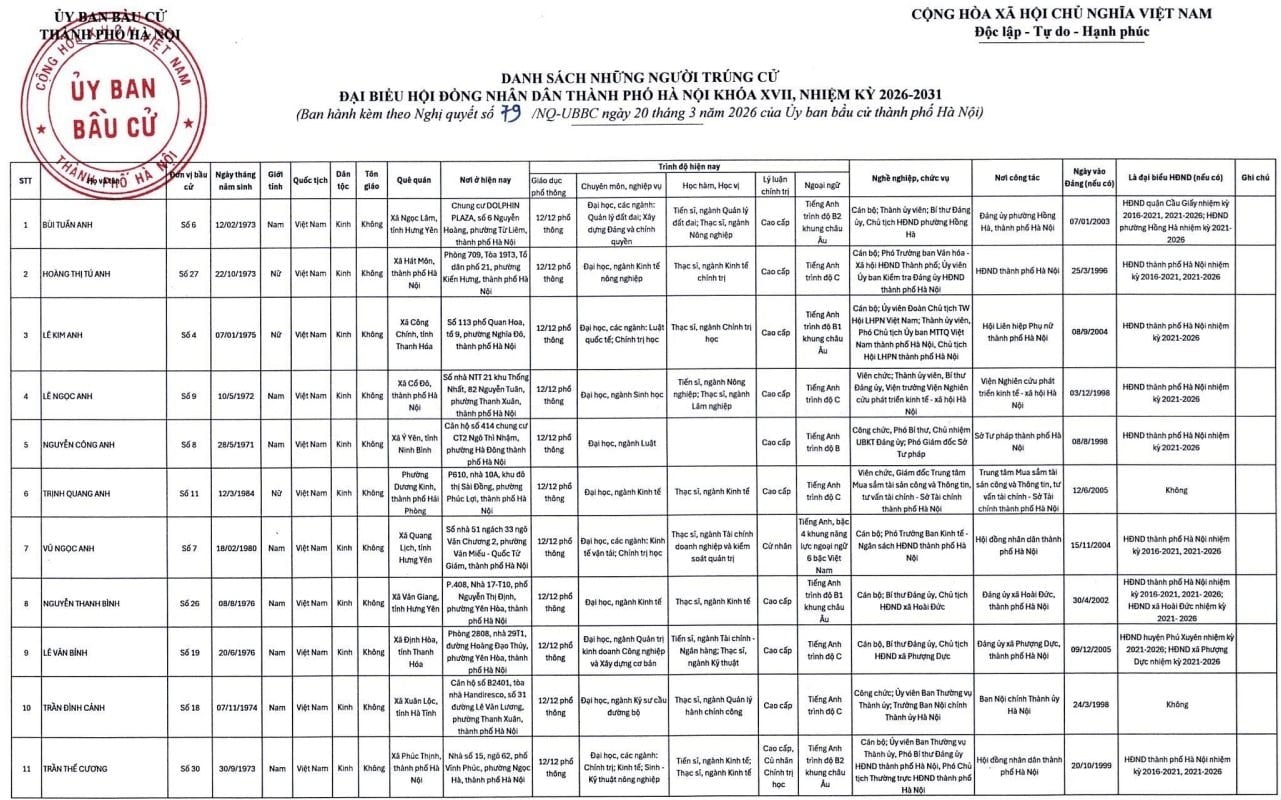 (Banker.vn) Ngày 20/3, Ủy ban Bầu cử TP. Hà Nội ban hành Nghị quyết số 79/NQ-UBBC về việc công bố kết quả bầu cử và danh sách những người trúng cử đại biểu HĐND TP. Hà Nội khóa XVII, nhiệm kỳ 2026-2031.