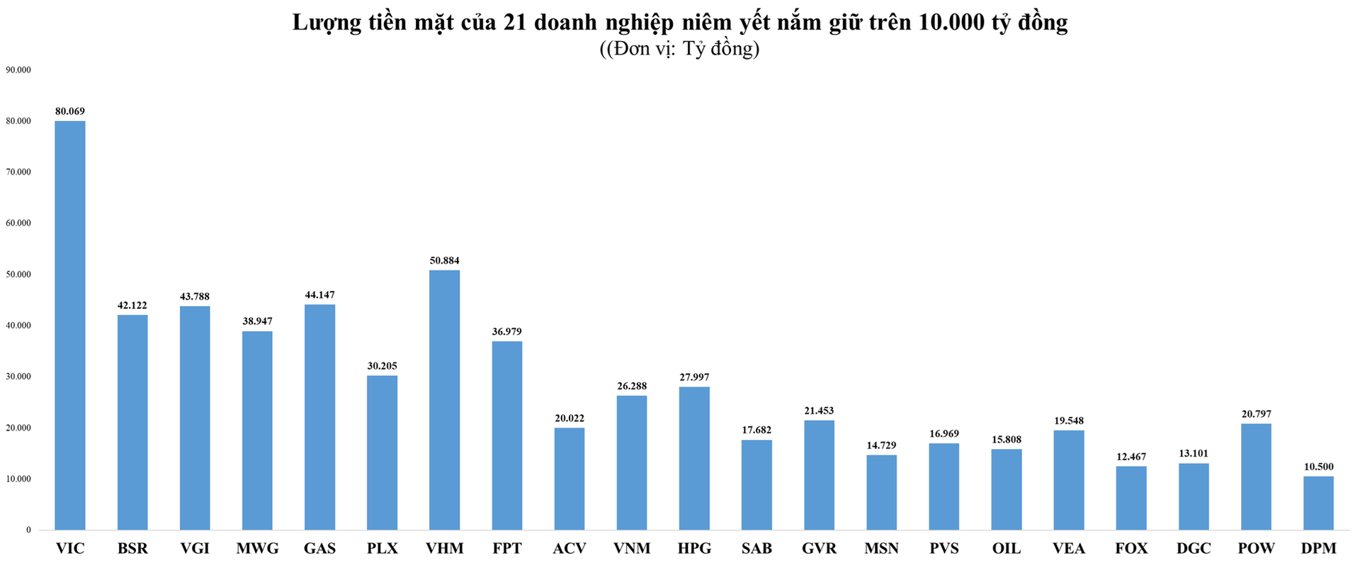 Không chỉ khu vực tư nhân, khối doanh nghiệp nhà nước và doanh nghiệp có vốn Nhà nước chi phối cũng ghi nhận lượng tiền nhàn rỗi lớn. Tổng công ty Khí Việt Nam, Công ty CP Lọc hóa dầu Bình Sơn và Tổng công ty CP Đầu tư quốc tế Viettel đều đang nắm giữ từ 42.000 đến 45.000 tỷ đồng tiền mặt.