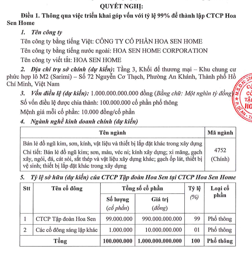 Theo nghị quyết, Chủ tịch HĐQT Lê Phước Vũ được cử làm người đại diện theo ủy quyền đối với toàn bộ phần vốn góp của Hoa Sen tại thời điểm thành lập, cũng như trong các lần tăng vốn tiếp theo nếu có.