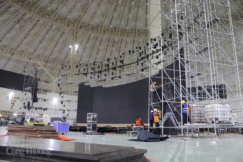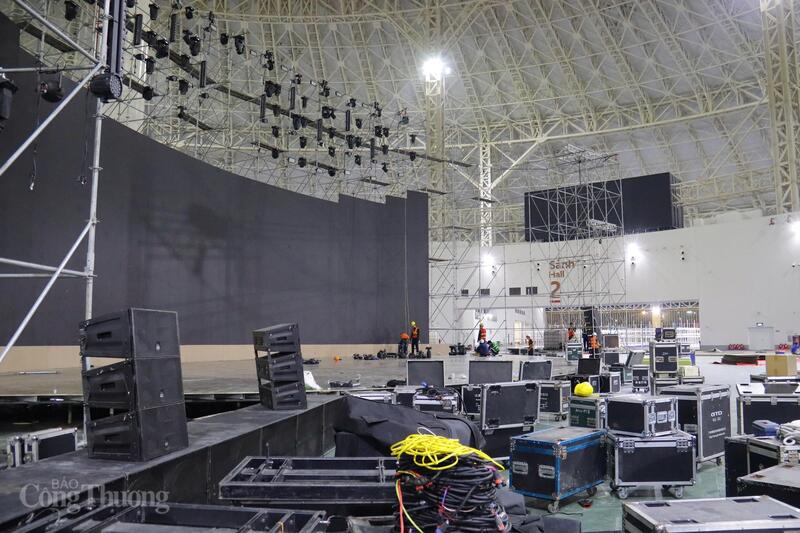 Đội ngũ kỹ thuật kiểm tra từng chi tiết âm thanh, ánh sáng trước lễ khai mạc. Ảnh: Thanh Tuấn