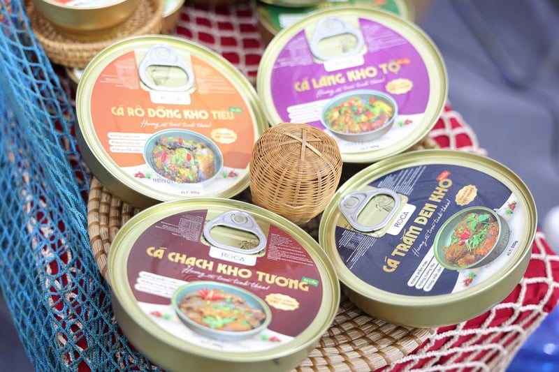 T-Link mang đến hội chợ 7 vị cá kho đóng hộp tiện lợi, nhiều hương vị cho khách hàng lựa chọn. Ảnh: Mai Linh