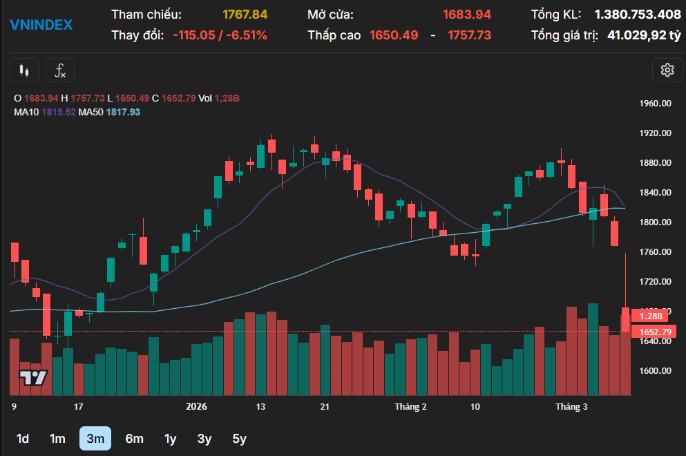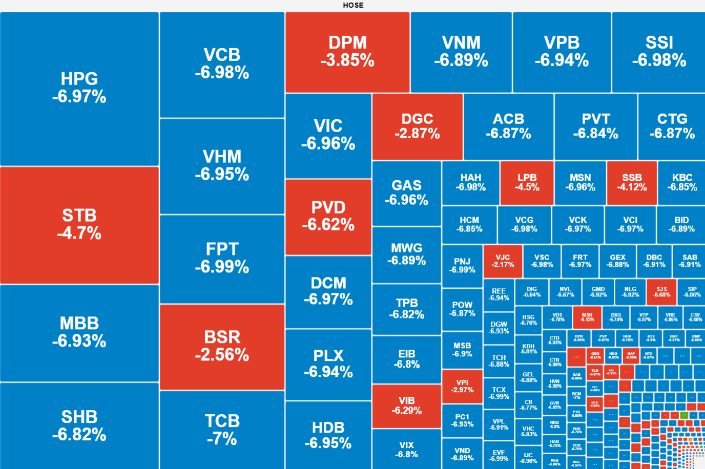 Kết thúc phiên giao dịch, sàn HOSE có tới 366 mã giảm, với 233 mã giảm sàn, trong khi chỉ còn 11 mã tăng, VN-Index giảm 115,05 điểm (-6,51%), xuống 1.652,79 điểm. Tổng khối lượng giao dịch đạt hơn 1,38 tỷ đơn vị, giá trị đạt 41.030 tỷ đồng, tăng gần 34% về khối lượng và 22% về giá trị so với phiên cuối tuần trước ngày 6/3. Giao dịch thỏa thuận đóng góp hơn 102 triệu đơn vị, giá trị đạt 2.781,4 tỷ đồng.