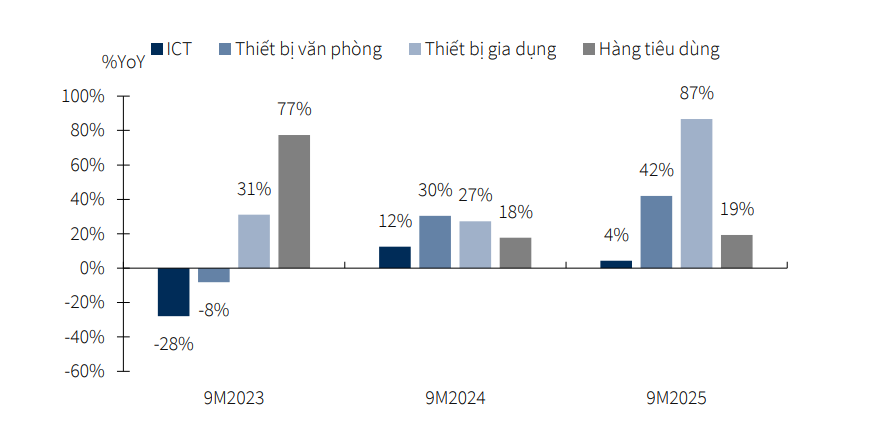 Sự nổi lên của mảng thiết bị văn phòng phản ánh một xu hướng mang tính cấu trúc. Theo dữ liệu phân tích của Chứng khoán KBSV, tăng trưởng của mảng này đến chủ yếu từ nhóm sản phẩm máy chủ và giải pháp máy chủ – máy khách, với mức tăng trên 50%, cùng nhóm thiết bị IoTs tăng hơn 40%.