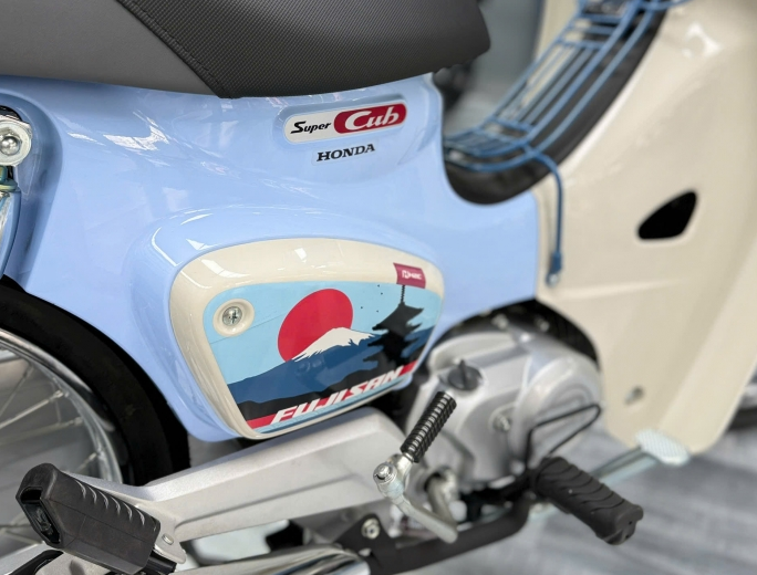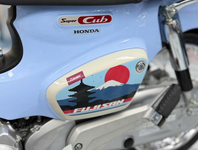 Super Cub Fuji San mang hơi thở của Nhật Bản mùa đông và bản giới hạn này sở hữu tông màu xanh dương và trắng dịu mát mang tới cảm giác sạch sẽ, cổ điển và thanh lịch. Trên nền màu đó là các họa tiết núi lửa và mặt trời theo phong cách retro, gợi hình ảnh Phú Sĩ như một biểu tượng văn hóa, chứ không chỉ là điểm đến du lịch.
