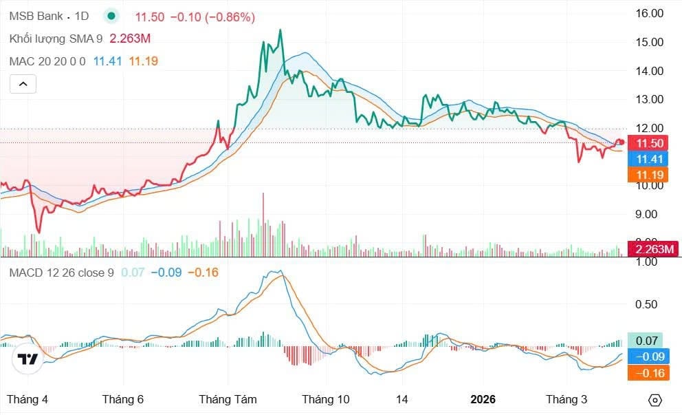 Diễn biến giá của MSB thời gian qua cho thấy sự dè dặt đó. Cổ phiếu nhà băng này chủ yếu đi ngang trong thời gian dài, với vùng hỗ trợ quanh 11.000-11.500 đồng/cổ phiếu và vùng cản quanh 14.500-15.000 đồng/cổ phiếu. Mỗi khi tiến gần vùng giá cao hơn, áp lực bán lại xuất hiện.