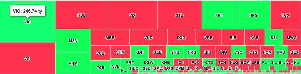 Chiều ngược lại, VCI là tâm điểm bị xả mạnh nhất với 198 tỷ đồng, phản ánh áp lực chốt lời tại nhóm chứng khoán sau nhịp hồi. Các cổ phiếu tài chính khác như HDB, VIX và STB cũng bị bán mạnh, giá trị từ 135–171 tỷ đồng, trong khi TCX bị bán 96 tỷ đồng. So với hôm qua, đà bán quay lại tập trung ở nhóm ngân hàng – chứng khoán, thay vì phân bổ đều như trước.