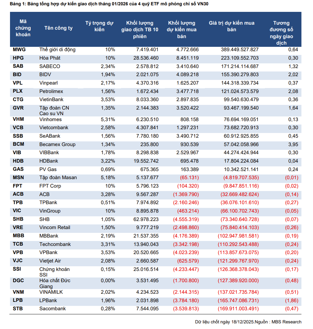 Ở chiều ngược lại, cổ phiếu DGC của Hóa chất Đức Giang được MBS dự báo có nguy cơ bị loại khỏi rổ chỉ số do vốn hóa suy giảm đáng kể trong thời gian gần đây. Khối lượng bán ra từ các quỹ ETF trong trường hợp này ước tính vượt 1,7 triệu cổ phiếu, tạo áp lực cung mang tính kỹ thuật trong ngắn hạn.
