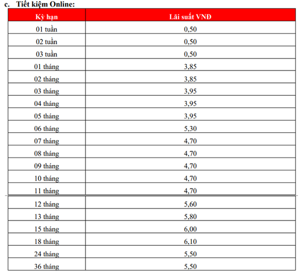 Kỳ hạn dài hơn từ 15 tháng đến 18 tháng có lãi suất lần lượt 5,9%/năm và 6%/năm. Đối với kỳ hạn 24 tháng và 36 tháng, ngân hàng vẫn duy trì mức 5,4%/năm, không thay đổi so với các kỳ điều chỉnh trước.