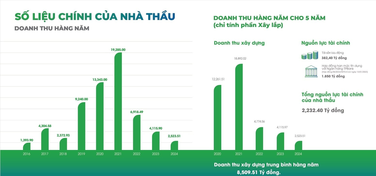 Tuy nhiên, từ năm 2022 trở lại đây, doanh thu có xu hướng thu hẹp đáng kể, giảm xuống khoảng 4.774 tỷ đồng năm 2022; còn 4.115 tỷ đồng năm 2023 và khoảng 2.523 tỷ đồng trong năm 2024. Dù vậy, nếu xét trung bình trong 5 năm gần nhất, doanh thu xây dựng vẫn đạt khoảng 8.509 tỷ đồng mỗi năm, cho thấy nền tảng hoạt động chưa suy giảm hoàn toàn.