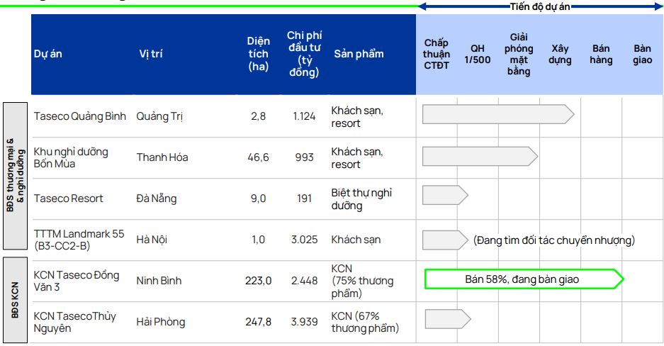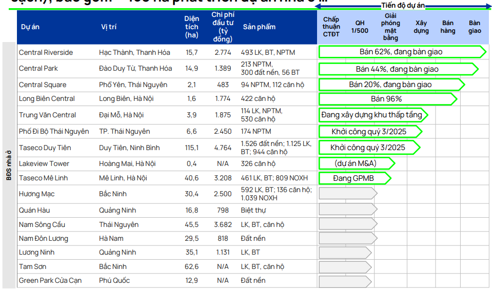 Bên cạnh hai dự án tại Hà Nội, TAL cũng tiếp tục ghi nhận doanh thu từ KCN Đồng Văn 3, cùng các dự án nhà ở tại Thanh Hóa và Thái Nguyên. Ngoài ra, một số dự án mới như Phố đi bộ Thái Nguyên, Taseco Duy Tiên hay Taseco Mê Linh có thể bắt đầu đóng góp một phần doanh thu trong giai đoạn cuối năm.