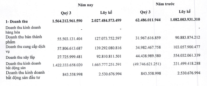 Theo giải trình của doanh nghiệp, kết quả tăng trưởng ấn tượng trong quý III đến từ việc hoàn tất chuyển nhượng dự án Khu nhà ở Lam Hạ Center Point tại phường Hà Nam 1, tỉnh Ninh Bình (trước đây thuộc TP. Phủ Lý, tỉnh Hà Nam cũ) với giá trị hơn 1.327 tỷ đồng, chưa bao gồm VAT.