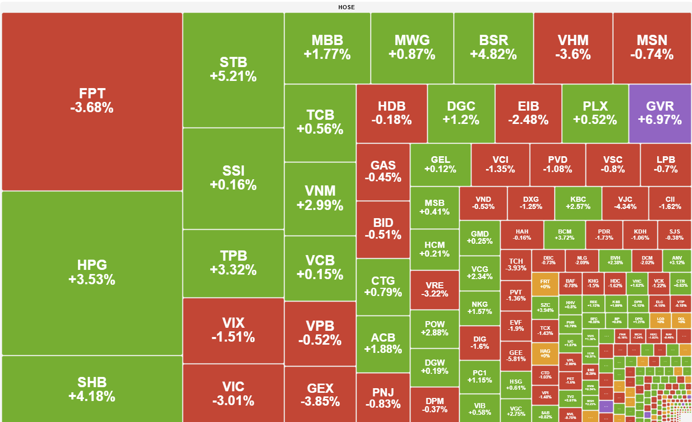 margin: 15px auto;" />Thị trường mở cửa trong trạng thái thận trọng dưới áp lực điều chỉnh ngắn hạn, khiến VN-Index nhanh chóng mất 5 điểm với sắc đỏ bao phủ nhóm công nghệ và Vingroup. Tuy nhiên, cục diện nhanh chóng thay đổi khi lực cầu mạnh mẽ gia nhập nhóm ngân hàng và bất động sản khu công nghiệp. Những cái tên như STB và GVR đồng loạt bứt phá lên mức giá trần, tạo động lực lan tỏa sang ngành thép và bán lẻ, giúp chỉ số có thời điểm thăng hoa khi tăng gần 20 điểm.