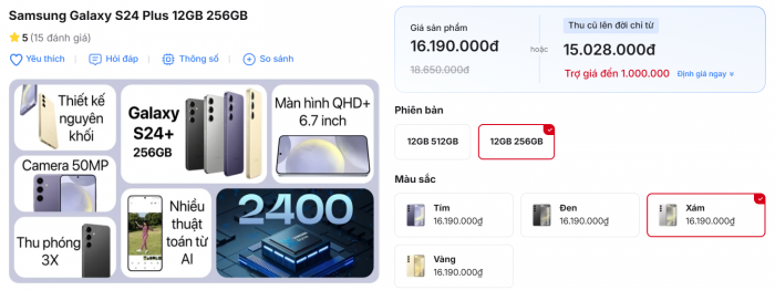 margin: 15px auto;" />Ở thời điểm đầu năm 2026, Galaxy S24 Plus bản 256GB đang được bán với giá khoảng 16,19 triệu đồng, trong khi bản 512GB cũng chỉ quanh mức 21,19 triệu đồng. So với iPhone 17 có giá cao hơn cả chục triệu đồng, mức chênh lệch này khiến Galaxy S24 Plus trở thành lựa chọn “ngon – bổ – dễ mua” cho người dùng ưu tiên màn hình lớn, pin bền và AI thông minh.