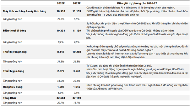 Ở chiều ngược lại, mảng điện thoại di động được dự báo chỉ tăng trưởng một chữ số trong giai đoạn tới. Dù vậy, áp lực suy giảm được đánh giá đã qua giai đoạn đáy, khi thị phần phân phối iPhone ổn định trở lại và các hãng Android giảm cường độ cạnh tranh về khuyến mãi sau giai đoạn cao điểm.
