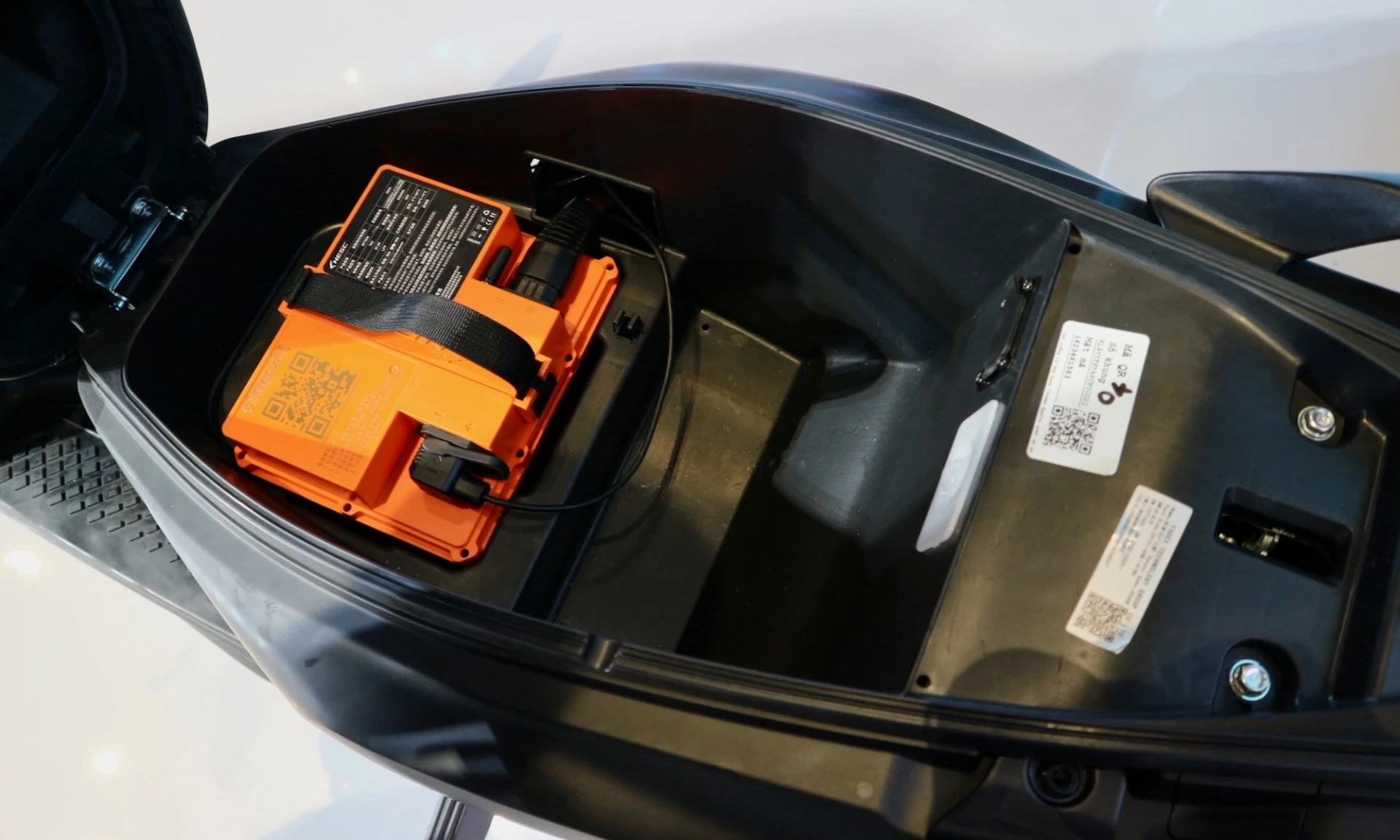 Một điểm cộng đáng chú ý là cổng sạc được bố trí phía trước, giúp người dùng thuận tiện hơn khi sạc xe. Pin có thể tháo rời để sạc ngoài, phù hợp với người sống tại chung cư hoặc nhà phố không có chỗ để xe cố định.