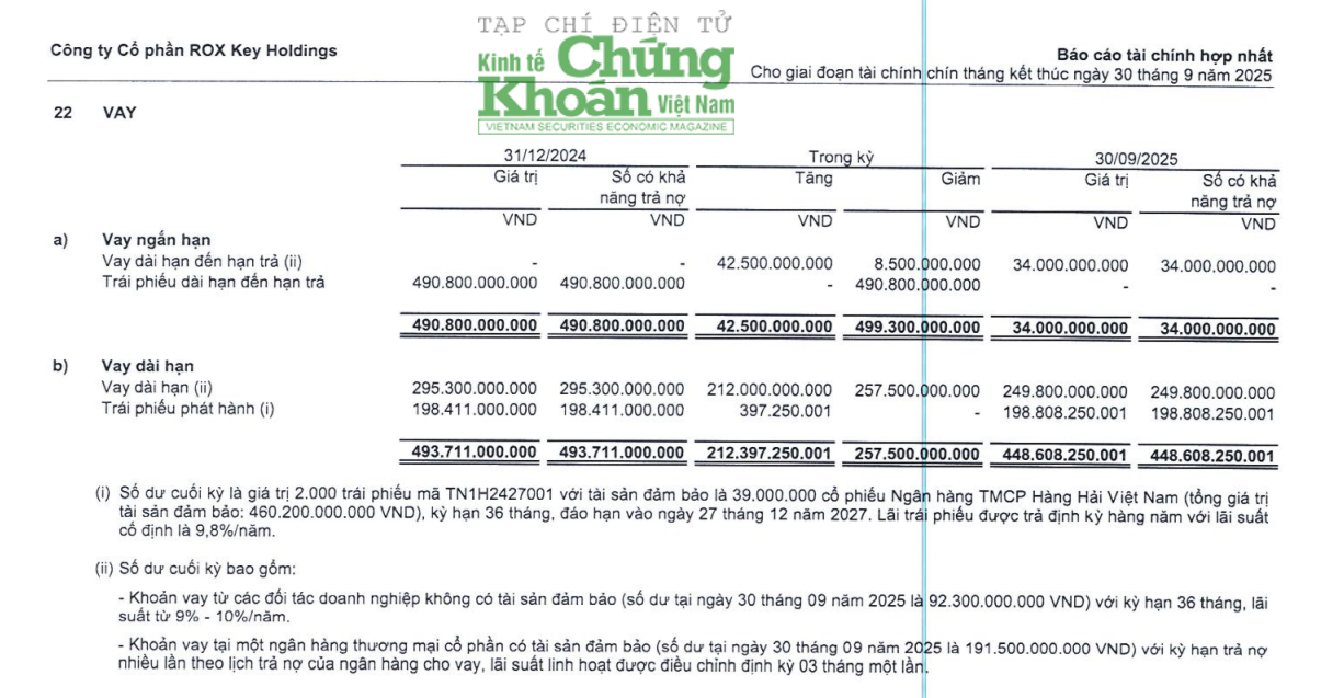 Việc sử dụng cổ phiếu MSB làm tài sản bảo đảm cho trái phiếu cho thấy mức độ gắn kết sâu giữa doanh nghiệp trong hệ sinh thái ROX Group và ngân hàng này, không chỉ ở vai trò cổ đông hay đối tác giao dịch, mà còn là tài sản cốt lõi để đảm bảo nghĩa vụ nợ dài hạn. Ngoài ra, báo cáo cũng ghi nhận doanh nghiệp còn phát sinh khoản vay tại một ngân hàng thương mại cổ phần có tài sản bảo đảm với dư nợ 191,5 tỷ đồng tại ngày 30/9/2025, song không nêu đích danh ngân hàng cho vay.