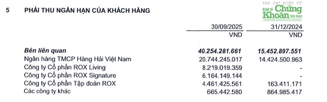 Ở góc độ công nợ, báo cáo tài chính quý III/2025 của ROX Key Holdings cho thấy khoản phải thu ngắn hạn từ MSB tăng lên đáng kể. Tại ngày 30/9/2025, tổng giá trị phải thu ngắn hạn từ các bên liên quan đạt hơn 40,25 tỷ đồng, tăng mạnh so với mức 15,45 tỷ đồng cuối năm 2024. Riêng MSB chiếm 20,74 tỷ đồng, tương đương khoảng 51,5% tổng phải thu từ các bên liên quan.