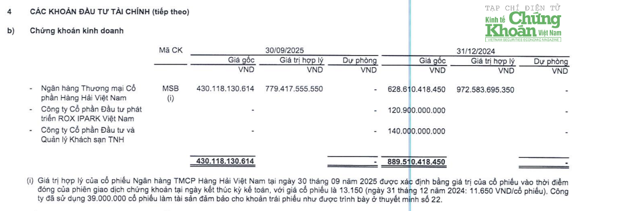Sang đến ngày 30/9/2025, dù giá gốc khoản đầu tư MSB giảm xuống còn 430,1 tỷ đồng, phản ánh việc thu hẹp quy mô nắm giữ, nhưng giá trị hợp lý vẫn đạt khoảng 779,4 tỷ đồng, cho thấy MSB tiếp tục giữ vai trò tài sản đầu tư trọng yếu.