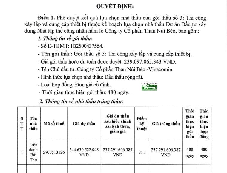 Theo quyết định do Giám đốc Đoàn Đắc Thọ vừa ký, gói thầu số 3 - Thi công xây lắp và cung cấp thiết bị thuộc dự án Nhà tập thể công nhân hầm lò được trao cho liên danh Bài Thơ gồm 5 doanh nghiệp, trong đó đứng đầu là Công ty CP Tư vấn và Xây dựng Dân dụng – Công nghiệp. Các thành viên còn lại gồm Công ty CP Chuyển giao Công nghệ Hải Minh; Công ty CP Thiết bị Phòng cháy chữa cháy Quảng Ninh; Công ty CP Xây dựng Thương mại Mai Hưng; và Công ty CP Tư vấn Thiết kế Đầu tư Xây dựng và Thương mại CIC.