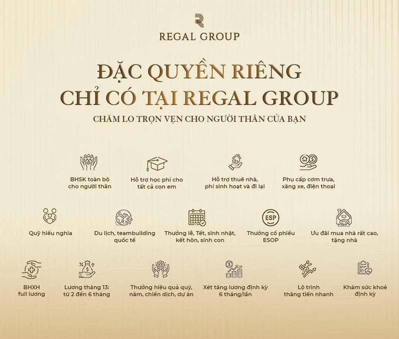 Trong bối cảnh thị trường nhân sự có nhiều biến động, bài toán giữ chân nhân tài tại Regal Group được giải quyết bằng một hệ thống phúc lợi toàn diện. Điểm khác biệt nằm ở sự chi tiết: từ việc đóng Bảo hiểm xã hội trên mức lương thực tế (full lương), bảo hiểm quốc tế cho cả gia đình nhân sự, đến những khoản hỗ trợ thiết thực như chi phí thuê nhà, sinh hoạt phí, xăng xe và điện thoại.