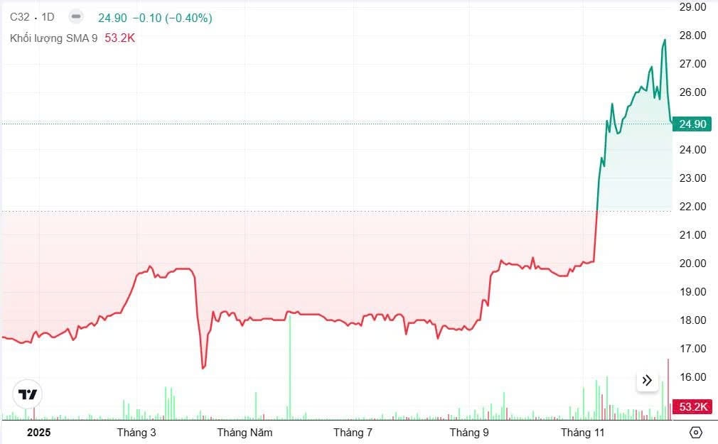 Trên thị trường chứng khoán, cổ phiếu C32 đang chịu áp lực điều chỉnh trong ngắn hạn. Kết phiên 19/12, mã này giảm nhẹ 0,4% xuống mức 24.900 đồng/cổ phiếu, nối tiếp 2 phiên giảm mạnh trước đó. Dù vậy, nếu nhìn trong khung thời gian dài hơn, thị giá C32 vẫn ghi nhận mức tăng gần 45% trong vòng một năm qua.