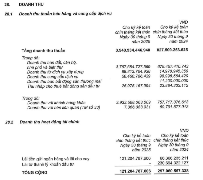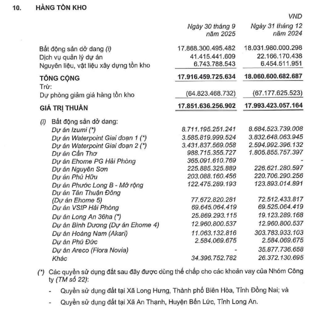 Xét theo từng dự án, Izumi City là khoản mục lớn nhất với 8.711 tỷ đồng, tăng 26,46 tỷ đồng so với cuối năm trước. Waterpoint Giai đoạn 1 đạt 3.585 tỷ đồng, giảm 247 tỷ đồng (giảm 6,4%), trong khi Waterpoint Giai đoạn 2 tăng mạnh 837 tỷ đồng, lên 3.432 tỷ đồng (tăng 32,3%).