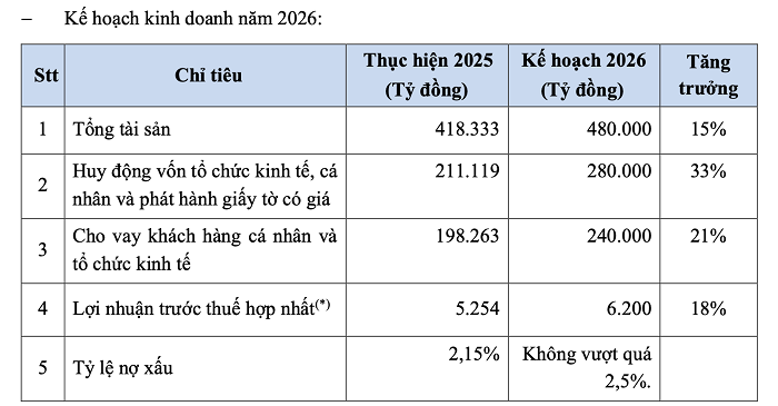 Trong năm 2026, Nam A Bank kỳ vọng lợi nhuận trước thuế hợp nhất đạt 6.200 tỷ đồng, tăng 18% so với 2025.