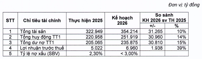 margin: 15px auto;" />Năm 2026 ngân hàng đặt mục tiêu lợi nhuận trước thuế đạt 6.960 tỷ đồng, tăng 39% so với con số thực hiện năm trước (5.022 tỷ đồng theo báo cáo tài chính kiểm toán).