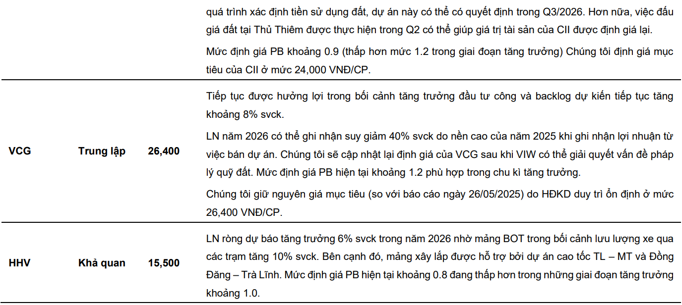 Trong khi đó, Vinaconex được dự báo sẽ ghi nhận sự cải thiện mạnh hơn về biên lợi nhuận nhờ đóng góp từ mảng bất động sản, đặc biệt là các dự án như Diamond Tower, trong khi mảng xây lắp duy trì ổn định quanh mức 5%. Ở nhóm hạ tầng, CII và HHV giữ biên lợi nhuận ổn định nhờ các dự án BOT đã đi vào vận hành.