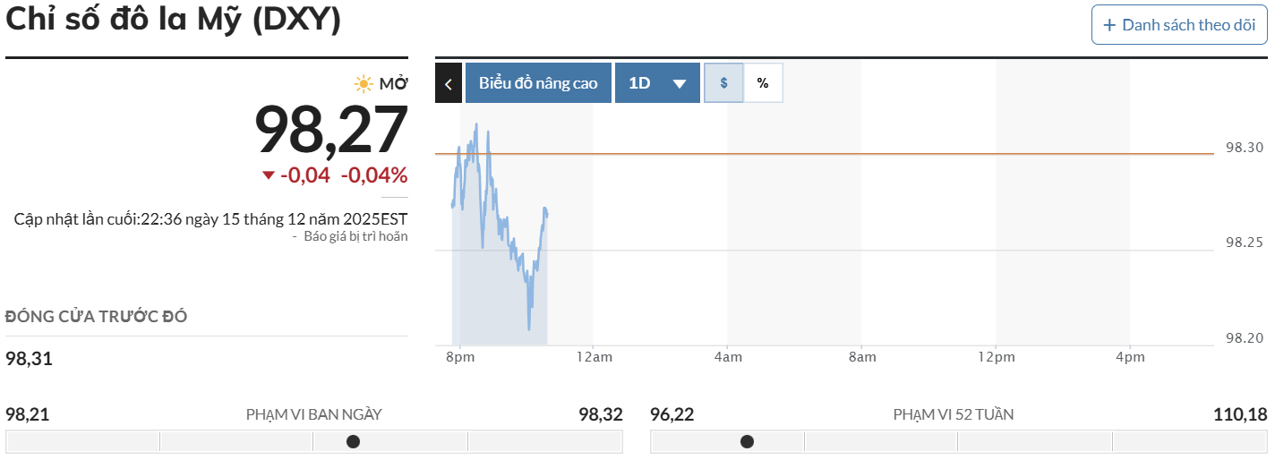 Cùng thời điểm, trên thị trường thế giới, chỉ số USD Index (DXY) - thước đo sức mạnh của đồng bạc xanh so với 6 đồng tiền chủ chốt - giảm 0,04%, hiện ở mức 98,27 điểm so với phiên liền trước.