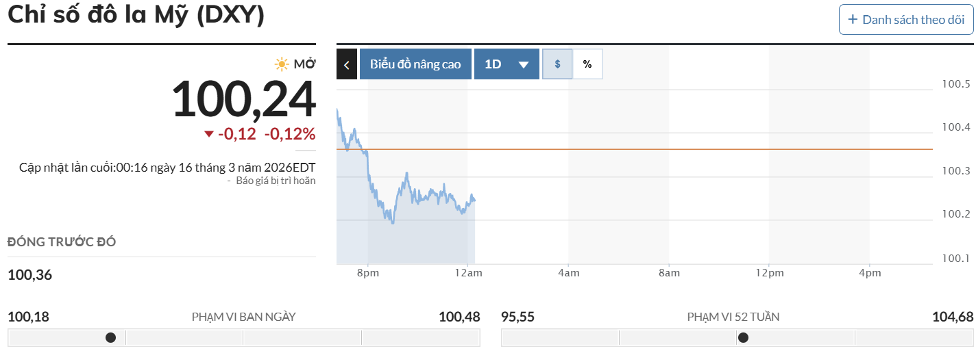 Cùng thời điểm, trên thị trường thế giới, chỉ số USD Index (DXY) - thước đo sức mạnh của đồng bạc xanh so với 6 đồng tiền chủ chốt - ở mức 100,24 điểm, giảm 0,12 điểm so với phiên giao dịch trước.