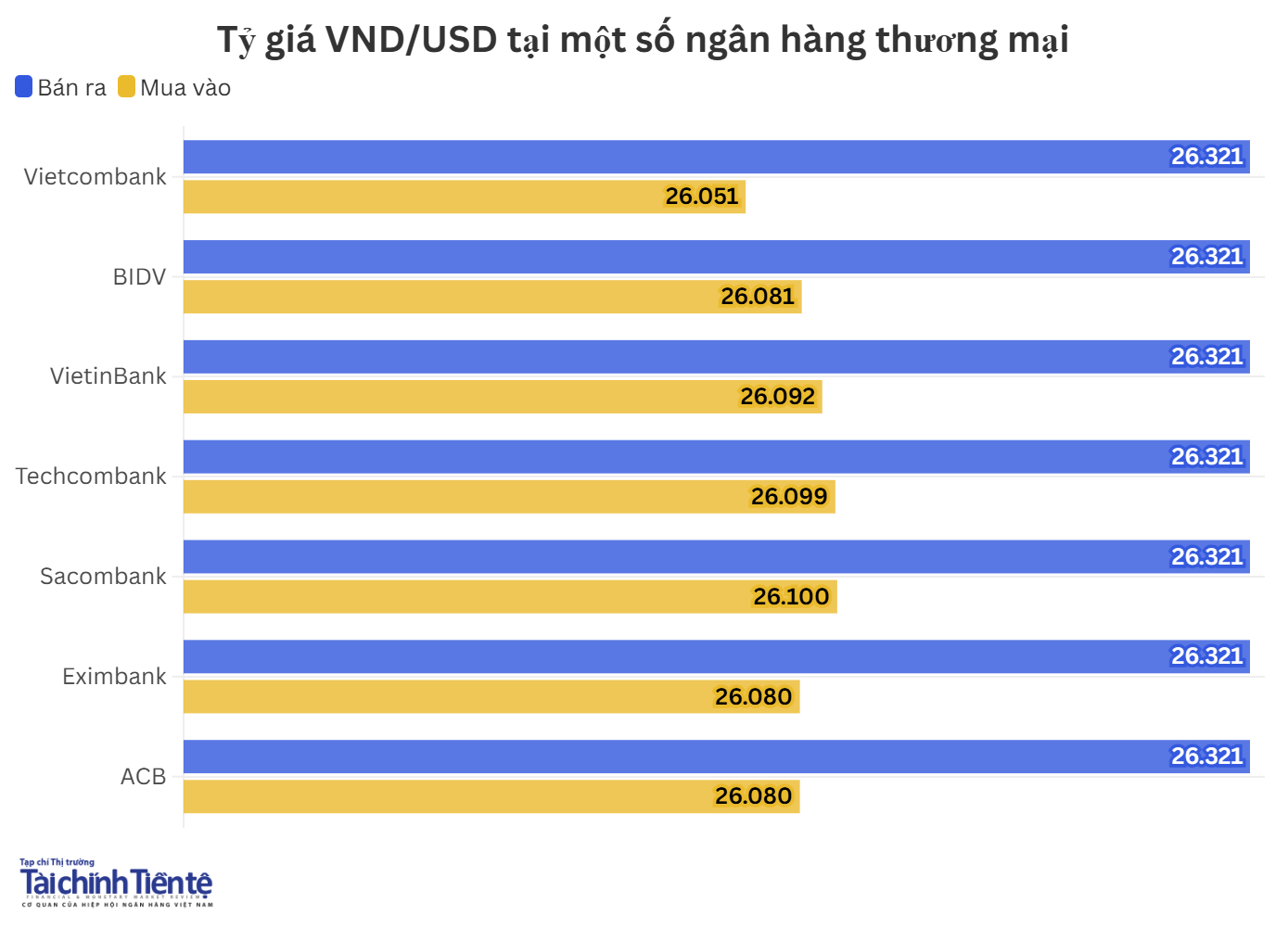 Hiện, giá mua thấp nhất ở mức 26.051 VND/USD, giá mua cao nhất ở mức 26.100 VND/USD. Giá bán được các ngân hàng niêm yết đồng loạt ở mức 26.321 VND/USD.