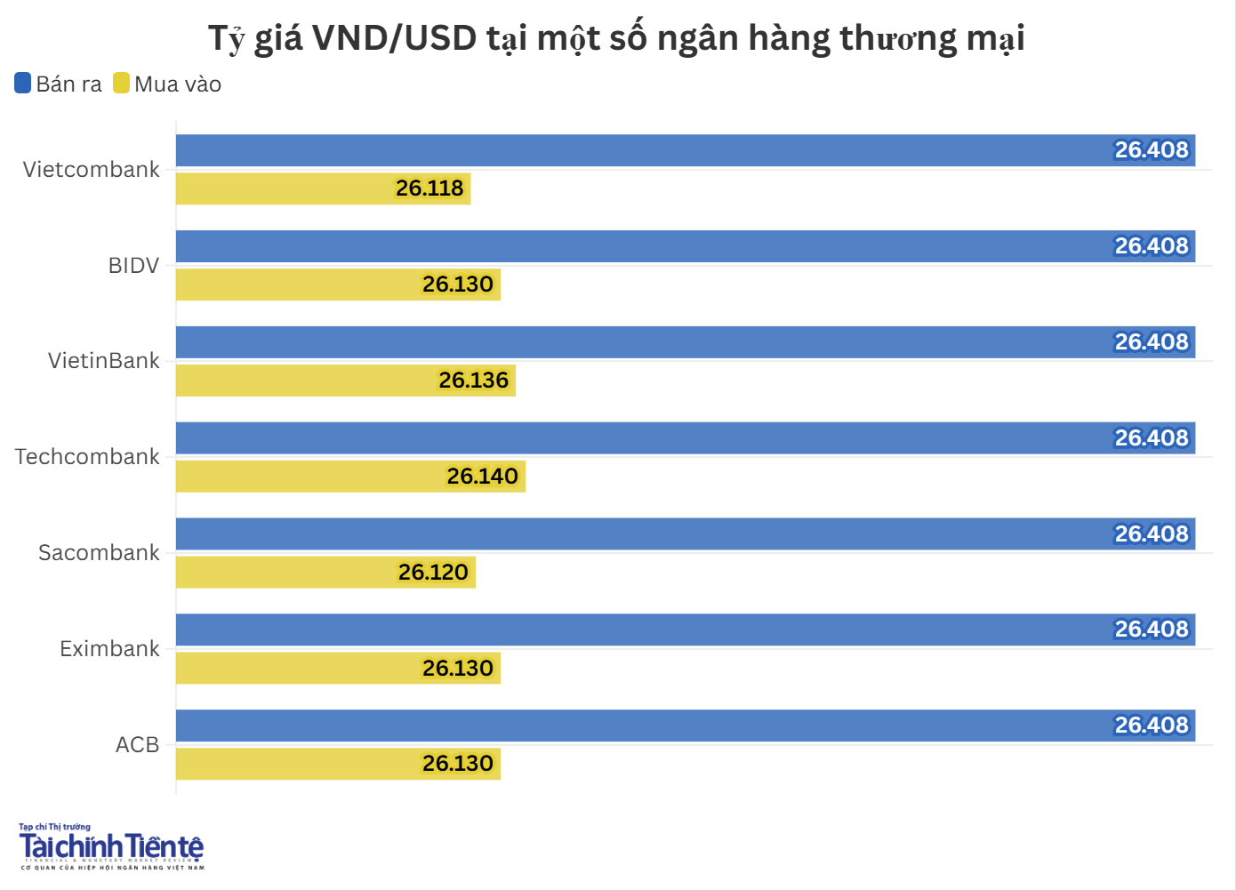 Hiện, giá mua thấp nhất ở mức 26.118 VND/USD, giá mua cao nhất ở mức 26.140 VND/USD. Giá bán ra được các ngân hàng đồng loạt niêm yết ở mức 26.408 VND/USD.