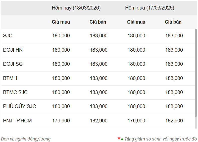 margin: 15px auto;" />Công ty Vàng bạc đá quý Sài Gòn (SJC), Tập đoàn Vàng bạc Đá quý DOJI, Bảo Tín Minh Châu, Bảo Tín Mạnh Hải và Phú Quý SJC đồng loạt niêm yết giá vàng miếng SJC mua vào-bán ra ở mức 180-183 triệu đồng/lượng, đi ngang ở cả chiều mua và chiều bán ra so với chốt phiên hôm qua (ngày 17/3).