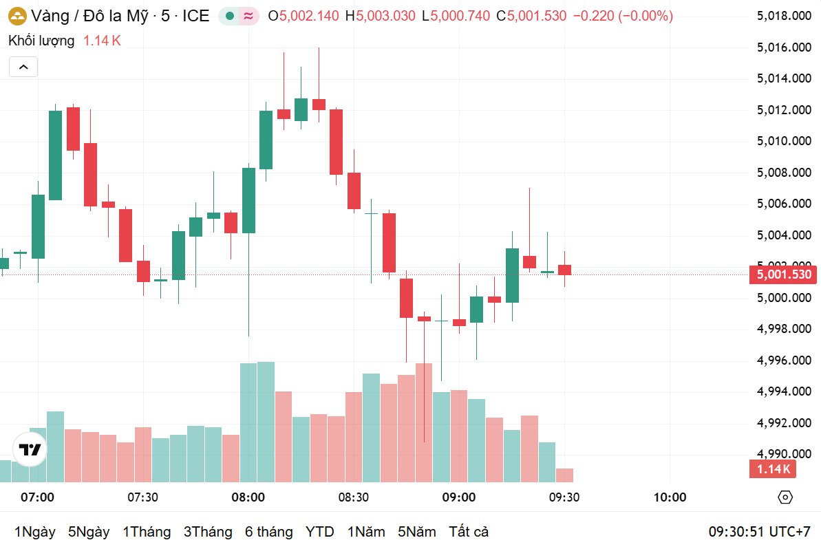 Thời điểm 9h30 theo giờ Việt Nam, giá vàng thế giới giao ngay ở mức 5.002 USD/ounce, tăng 0,11% trong 24 giờ qua, tương ứng với mức tăng 5,61 USD/ounce. Hiện, giá vàng thế giới quy đổi sang Việt Nam đồng khoảng 158,7 triệu đồng/lượng.