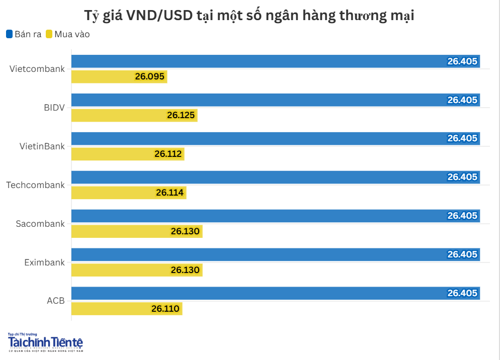 Hiện, giá mua thấp nhất ở mức 26.095 VND/USD, giá mua cao nhất ở mức 26.130 VND/USD. Giá bán ra được các ngân hàng đồng loạt niêm yết ở mức 26.405 VND/USD.