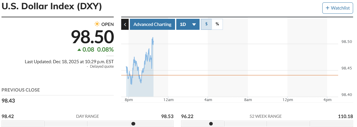 Chỉ số DXY nhiều khả năng khép lại tuần giao dịch gần như không đổi khi các nhà đầu tư cân nhắc triển vọng Ngân hàng Dự trữ Liên bang Mỹ (FED) sẽ tiếp tục cắt giảm lãi suất trong năm tới, trong bối cảnh lạm phát và thị trường lao động phát đi những tín hiệu suy yếu.