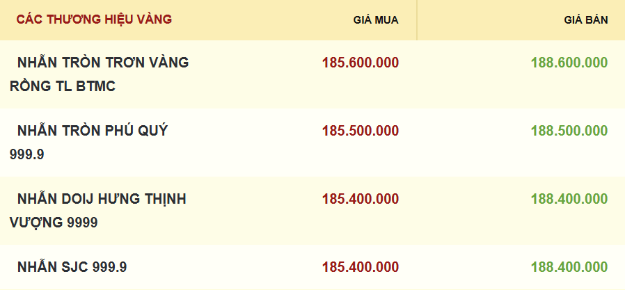 Cùng xu hướng, giá vàng nhẫn và vàng trang sức của các thương hiệu cũng được điều chỉnh tăng 1,6 triệu đồng ở cả 2 chiều mua và bán so với phiên sáng ngày hôm trước. Trong đó, giá mua-bán vàng nhẫn tròn trơn vàng rồng Bảo Tín Minh Châu niêm yết ở mức cao nhất 185,6-188,6 triệu đồng/lượng - tương đương vàng miếng. Các thương hiệu còn lại niêm yết giá vàng nhẫn mua vào ở mức 185,4 - 185,5 triệu đồng/lượng và bán ra trong khoảng 188,4 - 188,5 triệu đồng/lượng.