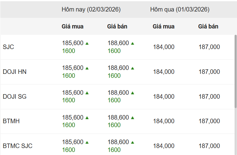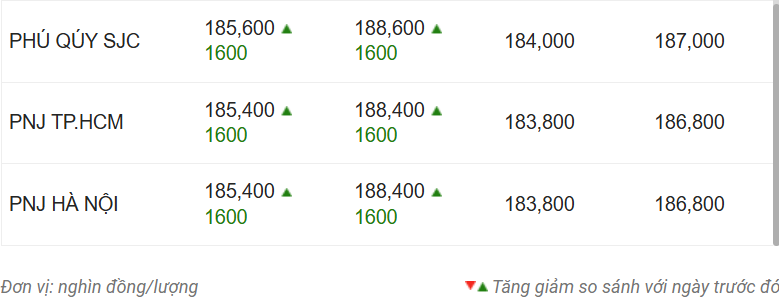 Công ty Vàng bạc đá quý Sài Gòn (SJC), Tập đoàn Vàng bạc Đá quý DOJI, Bảo Tín Minh Châu, Bảo Tín Mạnh Hải và Phú Quý SJC cùng niêm yết giá vàng miếng SJC mua vào-bán ra ở mức 185,6-188,6 triệu đồng/lượng, tăng 1,6 triệu đồng ở cả chiều mua và chiều bán ra so với phiên trước.