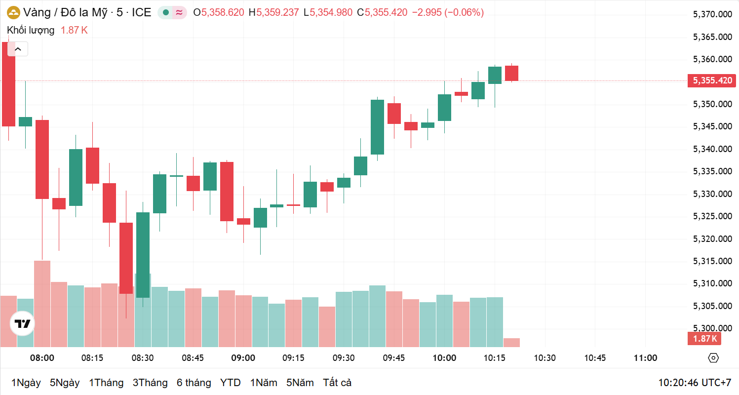 Giá vàng trong nước duy trì mức cao và tăng mạnh từ 5 - 8 triệu đồng/lượng so với tuần trước đó. Giới chuyên gia nhận định, giá vàng trong nước tiếp tục diễn biến theo thị trường thế giới. Thời điểm 9h45 sáng nay theo giờ Việt Nam, giá vàng thế giới giao ngay ở mức 5.356 USD/ounce, tăng 2,36% trong 24 giờ qua, tương ứng với tăng 123,38 USD/ounce. Hiện, giá vàng thế giới quy đổi sang tiền Việt Nam đồng khoảng 169,7 triệu đồng/lượng.